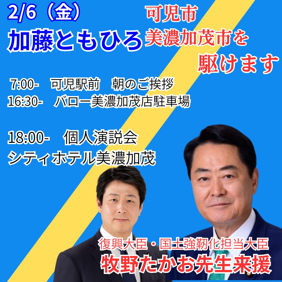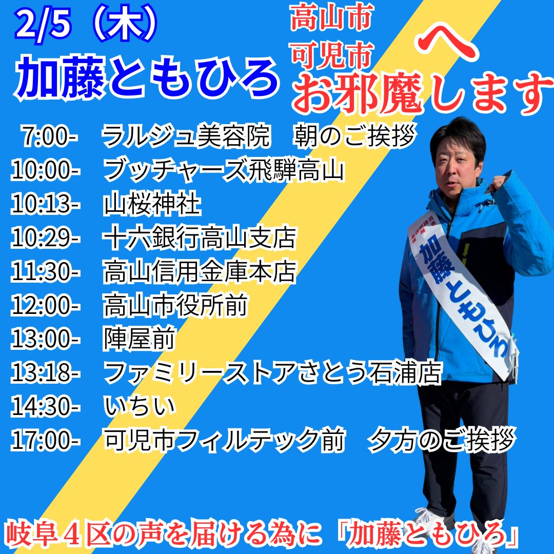 【2月5日(木)】各所で街頭演説を行います。