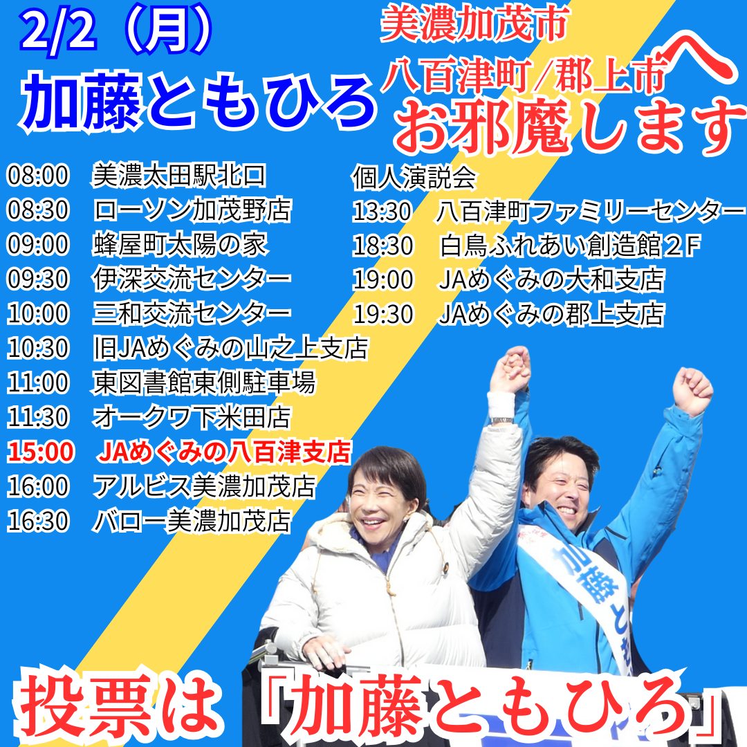 【2月2日(月)】各所で街頭演説を行います。